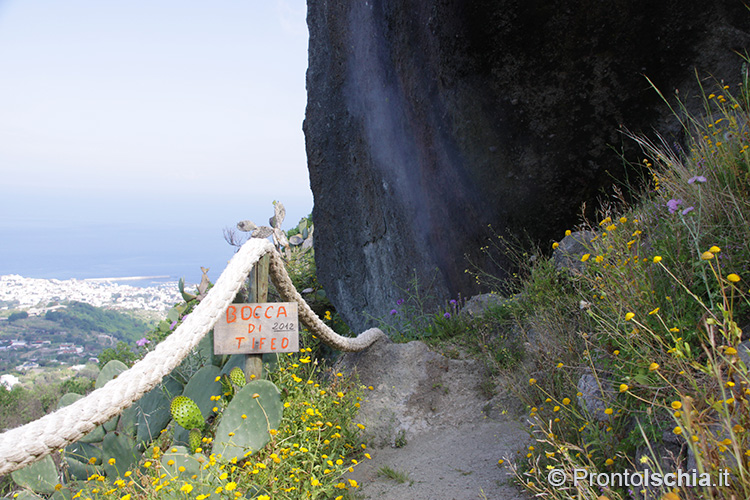Dei tre sentieri, l’ultimo ad essere ripristinato dai generosi volontari della Pro Loco di Panza. Bisogna percorrere la piana di Montecorvo, tranquilla zona residenziale del comune di Forio, e proseguire per via Pietra Brox, strada di campagna fiancheggiata dalle numerose viti della tenuta "C'est la Vie" (ex Giardini Arimei), tenuta agricola un tempo appartenuta ai Milone, potente famiglia calabrese con molti possedimenti sull’isola d’Ischia. Il sentiero che porta alla fumarola "Bocca di Tifeo", chiamata così in ossequio a uno dei miti di fondazione dell’isola d’Ischia (quello del gigante Tifeo) si dipana proprio dall’ingresso della tenuta C'est la Vie. Circa 800 metri in salita tra "parracine" (i muri a secco locali) e terrazzamenti dismessi, segno che un tempo la produzione vinicola lambiva l’intero fianco occidentale del Monte Epomeo. L’escursione termina davanti un mega blocco di tufo verde dalla cui "pancia" esce una spessa nube di gas ben visibile già a valle del sentiero. Ultima annotazione, il bellissimo panorama che abbraccia l’intero litorale di Forio, da Punta Imperatore fino a Punta Caruso.