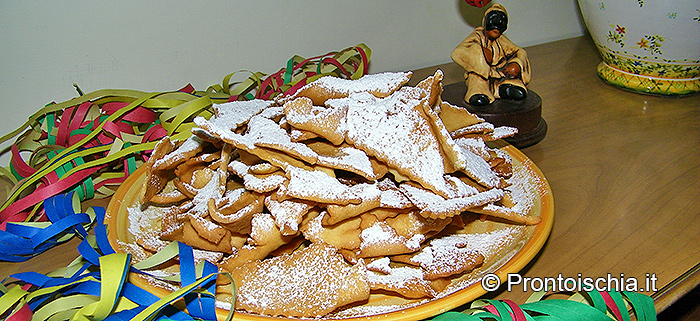 Cosa c'è di meglio del buon cibo e della convivialità di una bella tavola per "sospendere" il carico di preoccupazioni e sfide che la vita ci riserva quotidianamente? E siccome il significato profondo del Carnevale sta proprio in questa "sospensione", ecco che la festa si accompagna da sempre ad alcune pietanze irrinunciabili. A Ischia i piatti tipici del Carnevale sono gli stessi di Napoli, vale a dire lasagna, chiacchiere e migliaccio. Scontato dire che le varianti sul tema sono pressoché infinite, però, grosso modo, il pranzo di Carnevale gira attorno queste tre prelibatezze. Piatti che, come nella migliore tradizione partenopea, hanno due pregi fondamentali: sono facili da preparare e buonissimi da mangiare.