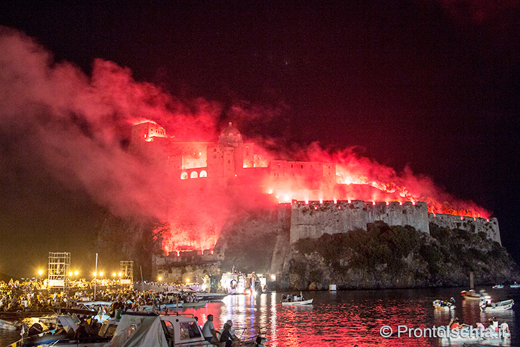 In apertura abbiamo fatto riferimento all'importanza delle tradizioni nell'estate ischitana. Si comincia il 24 giugno, ultimo giorno del solstizio d'estate, con la 'ndrezzata sul sagrato della chiesa di San Giovanni Battista a Buonopane, ma la festa più importante di tutte, quella che richiama migliaia di turisti da ogni parte della Campania e non solo, è la Festa a Mare agli Scogli di Sant'Anna, il 26 luglio. Nella foto l'incendio simulato del Castello Aragonese, evoluzione dell'antica tradizione dei falò che venivano appiccati per l'occasione sulle colline di Campagnano e Soronzano, attorno la baia di Cartaromana.